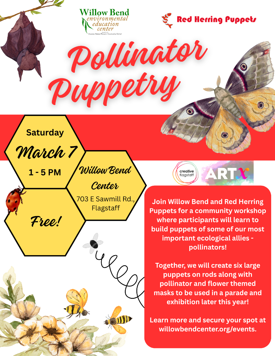 The project now moves into its community phase. On March 7 from 1 to 5 PM, Willow Bend will host a Community Puppet Building and Finishing Workshop where participants will help paint and assemble the pollinator puppets alongside Red Herring Puppets and Willow Bend staff. Because of the detailed crafting involved, this workshop is best suited for older teens and adults, though youth are welcome with adult supervision. Space is limited, and advance registration is required.