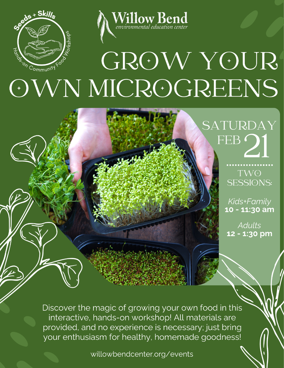 Registration opens Friday, 2/13 at 9AM!This page is for the adult session of the Microgreens workshop. To sign up for the kids and family workshop, please see this page: https://willowbendcenter.app.neoncrm.com/event.jsp?event=1656&.